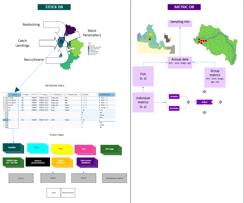 Holistic assessments of the species require the coordinated collection and storage of a great diversity of data on biological parameters, especially LHTs, and on the impact of fisheries and other anthropogenic mortalities, with a spatial resolution coherent with the needs of SSAMs. Traditional databases are not well suited to handle such a diversity of habitat and human impacts. Currently, both ICES WGEEL and WGNAS have developed “home-made” databases stored in local institutions, alongside interactive applications to explore and integrate the data. This situation is far from optimal in terms of operability, data availability, data security and transparency. Moving towards a transparent assessment framework (TAF) procedure requires simpler and more transparent ways of querying several central databases to get the raw data and do the assessment. The objective of this WP is to create database structures to store data to feed models that are currently in use, as well as data that will be useful in the future to support a holistic and transparent assessment. The Specific objectives are: